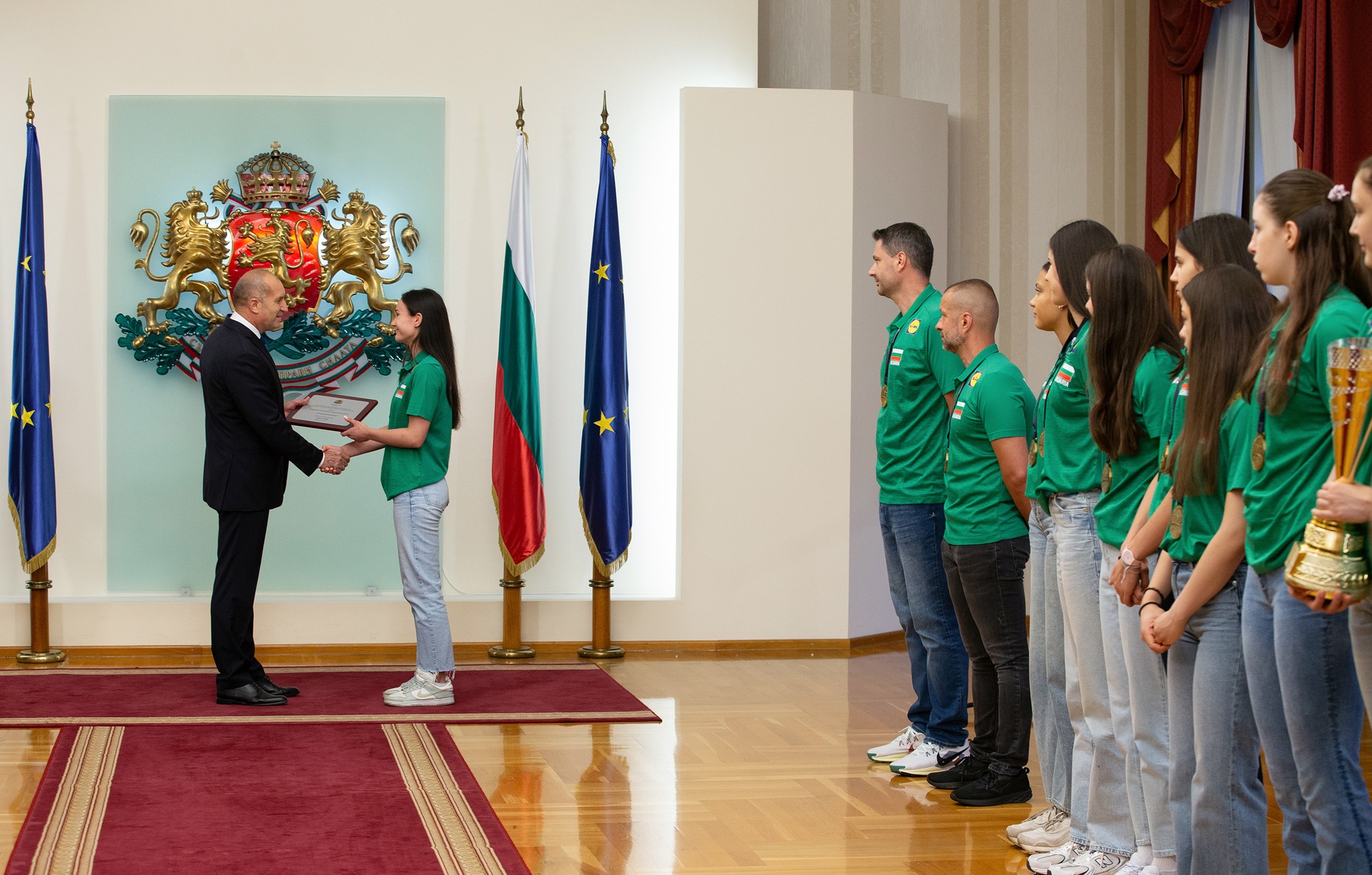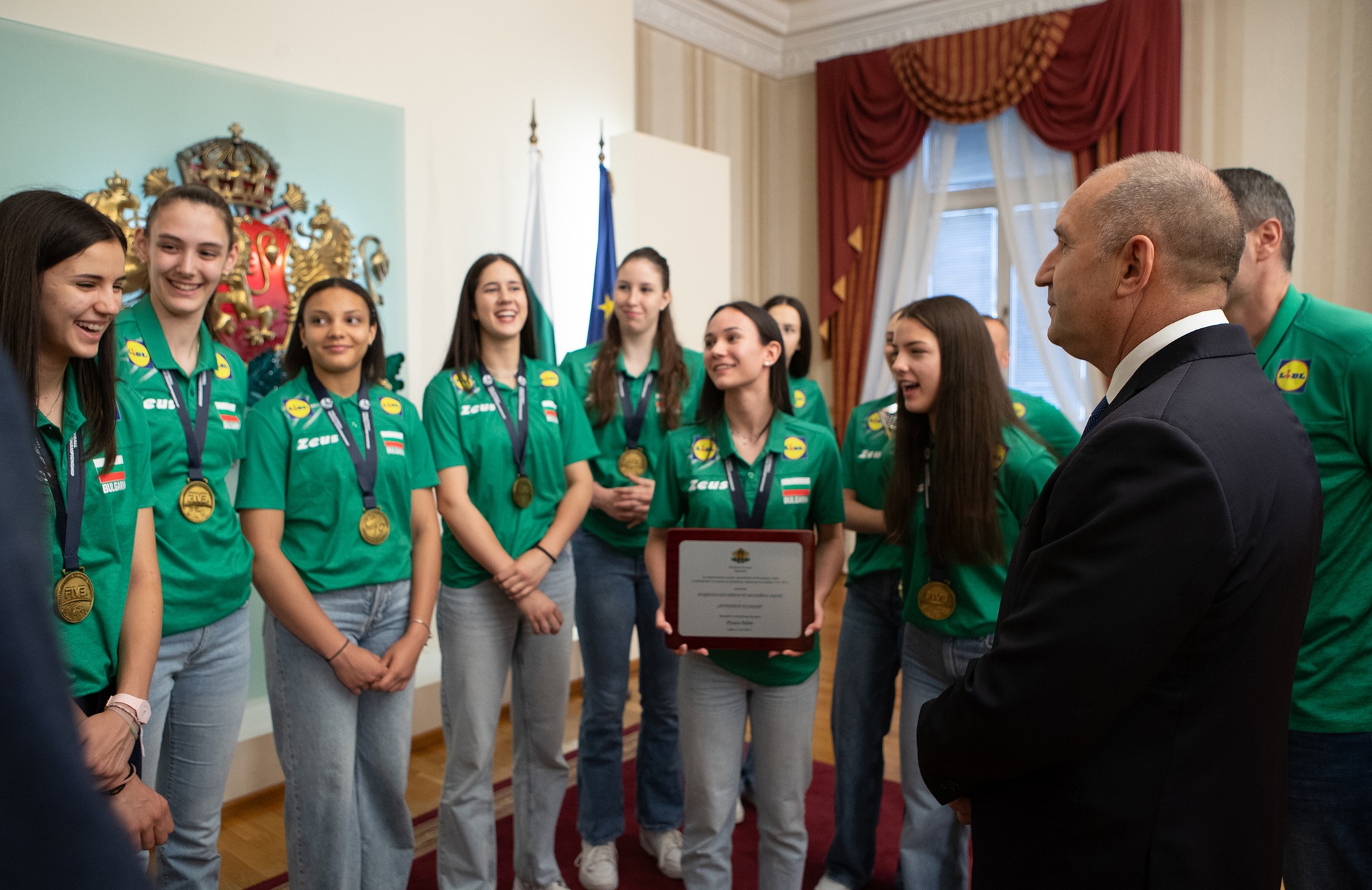 За мен е огромно удоволствие да посрещна отново в президентската институция националния отбор на България по волейбол за жени до 19 години и да ги удостоя с Почетен плакет на президента на Република България за спечелената световна титла.
