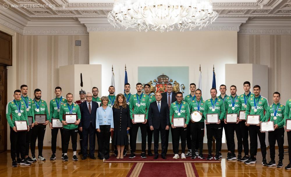Няма да се обръщам към вас с „момчета“. Бяхте момчета, когато дойдохте тук преди две години след бронза от Бахрейн. Днес тук са достойни български мъже, поели отговорност да отстояват честта на Родината. Това заяви държавният глава Румен Радев в приветствие към мъжкия национален отбор на България по волейбол. На церемония в Гербовата зала на президентската институция днес президентът награди с почетни плакети състезателите и треньорският щаб на отбора, както и Българската федерация по волейбол по повод спечелените сребърни отличия и силното представяне на Световното първенство във Филипините. В церемонията участва и вицепрезидентът Илияна Йотова.
